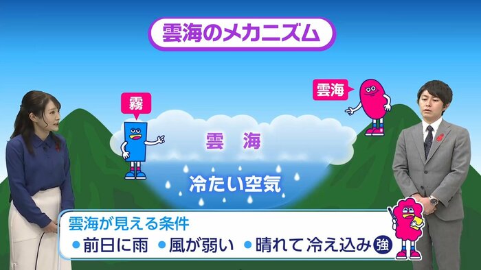 そこできょうは古山予報士が雲海のメカニズム、「雲とはどう違うんかい?」「霧とも違うんかい?」ということをお伝えする。