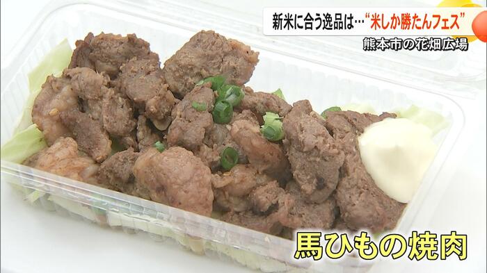 販売されていた馬ひもの焼肉は、ニンニクの風味がきいて飯が進む。新米は甘みがあっておいしく、まさにコメに合う、米しか勝たん組み合わせだ。