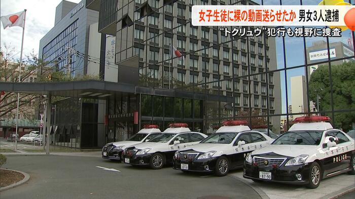 警察によると、3人は共謀し2024年9月に熊本県中央部に住む10代の女子生徒に対し、18歳未満であると知りながら、裸の動画や静止画を撮影させ、SNSで送信させた疑いが持たれている。