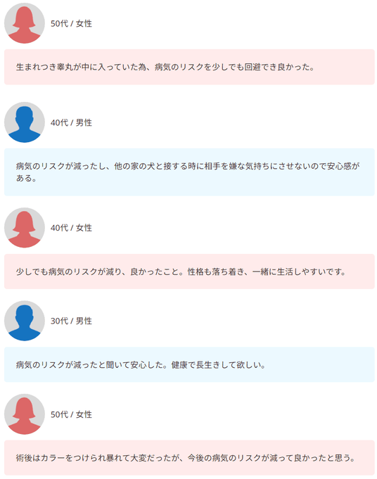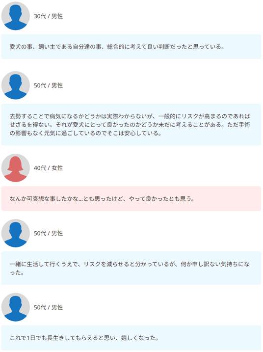 一方で「病気予防につながって安心した」「長生きしてほしい」といった前向きな意見も目立ち、最終的には手術を肯定的に捉える声が多く寄せられました。