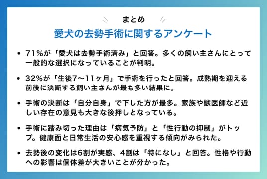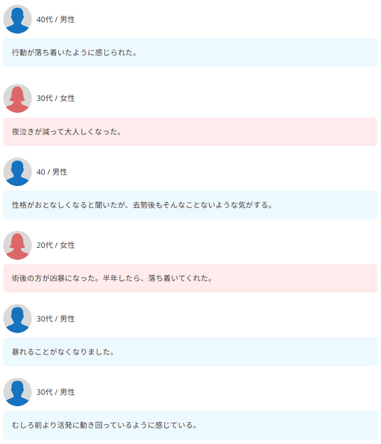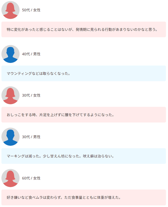 一方で4割は「特に変化なし」と回答。「性格が大人しくなると聞いていたが、実際はそうでもなかった」といった意見も寄せられ、必ずしも手術によって性格や行動が変わるわけではないことが分かりました。