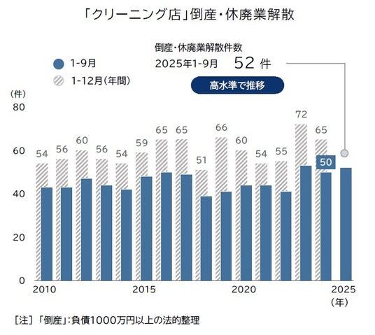 2025年1-9月に発生したクリーニング店の倒産は18件、休廃業・解散は34件で、合計52件が市場から退出した。テレワークの普及に加え、オフィスウェアのカジュアル化、家庭用洗濯機の高機能化といった要因が重なり、クリーニング需要の減退が続く。資材高など運営コストも上昇したが、客離れを危惧して十分な価格改定に踏み込めず、業績が悪化するケースが増えている。