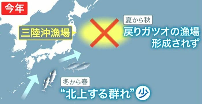 南から来るカツオはなかなか東北海域に来遊しにくいという、Wパンチみたいな状況。