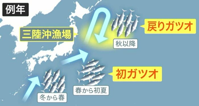 カツオは例年、春先まで南の暖かい海域で過ごし、夏にかけて若い一部の魚群が豊富なエサを求めて三陸沖まで北上する。この北上する途中の脂乗りが少ないものが「初ガツオ」、北の海で脂を蓄えたものが「戻りガツオ」と呼ばれる。