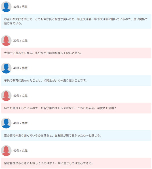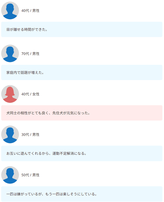 さらにワンちゃん同士で遊ぶことで運動不足が解消されたり、先住犬が元気になったとのポジティブな声も。