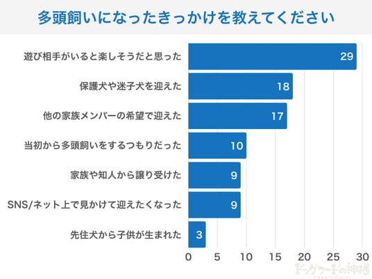- 多頭飼いのきっかけ第1位は「先住犬に遊び相手を作ってあげたい」という思いから。