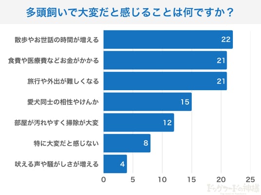 多頭飼いで最も多かった悩みは「散歩やお世話の時間が増える」(22票)。次いで「食費や医療費がかかる」(21票)、「旅行や外出が難しくなる」(21票)が上位に並びました。