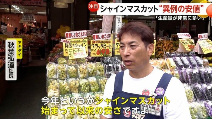 2025年というか、シャインマスカット始まって以来の安さですよ。生産量が非常に多いというのはありますよね。生産者がいろいろなブドウをやめて、どんどんシャインマスカットになっていったというのはありますよね。