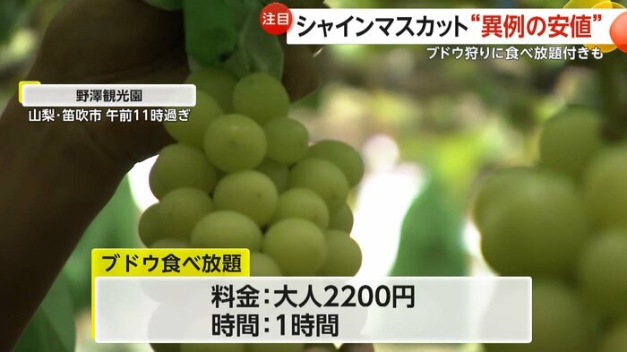 山梨・笛吹市にある野澤観光園は今、ブドウ狩りシーズンの真っ只中にある。大人2200円でシャインマスカットやピオーネなどが1時間食べ放題だ。