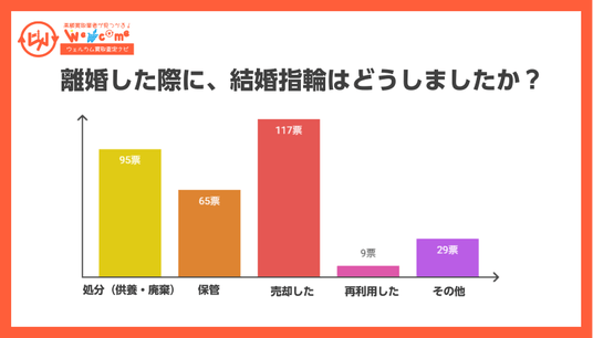 今回のアンケートでは、離婚した際に「結婚指輪をどうしたか」という質問に対し、最も多かったのは 「売却した(117票)」 という回答でした。