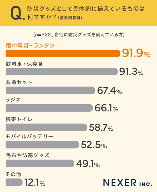 防災グッズとして最も広く備えられているのは、懐中電灯・ランタンが91.9%、飲料水・保存食が91.3%で、9割以上の方が命と最低限の暗闇対策を優先していることが分かります。