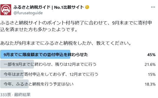 アンケート回答者の45%が「9月末までに限度額までの寄付申込を終わらせた」、21.6%が「一部を9月までに終わらせ、残りは12月までに行う」とそれぞれ回答しました。