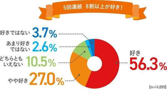 から揚げの好意レベルを聞いたところ、5回連続で8割近くが好きと回答した(「好き(56.3%)」、「やや好き(27.0%)」)。