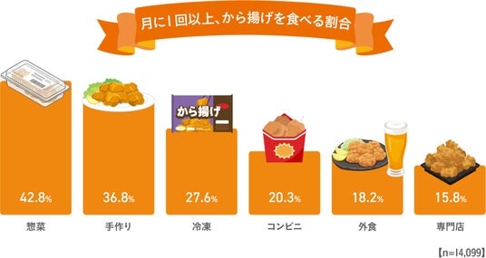 1ヶ月以内のから揚げ喫食率をルート別でみると、「惣菜」が42.8%と最も多く、次いで「手作り(36.8%)」「冷凍食品(27.6%)」「コンビニ(20.3%)」「外食(18.2%)」「鶏のから揚げ専門店(15.8%)」であった。