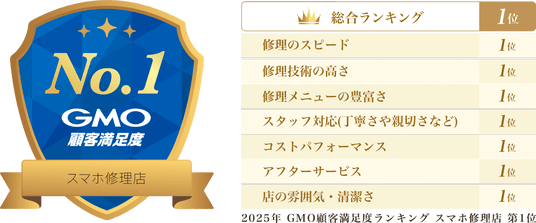 「GMO顧客満足度ランキング」はGMOリサーチ&AI株式会社が、サービスや商品の利用者から満足度や体験に関する詳細なフィードバックを収集し、多角的な視点から評価を行い公平かつ正確に可視化する信頼性の高いランキングです。「スマホ修理店」カテゴリーは過去3年以内にスマートフォン・携帯電話の修理店舗、修理サービスを利用したユーザーからのアンケート結果に基づいており、複数のエリアで店舗展開をしている13の修理会社(修理ブランド)が調査対象となっています。