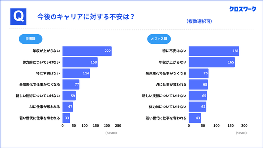 両者とも「将来の不安」は年収。現場職は体力、オフィス職はAI・景気も