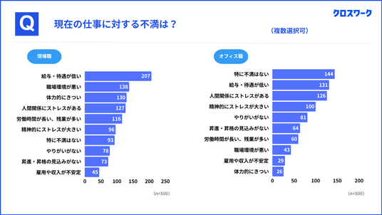 「仕事の不満」現場職は体力・環境、オフィス職はメンタル面が目立つ