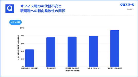 本調査の結果、オフィス職の7割が「条件次第で現場職に転職もアリ」と考えていることが判明しました。また、AI代替リスクの認識が強い層ほど現場職志向が高まることも明らかになっています。