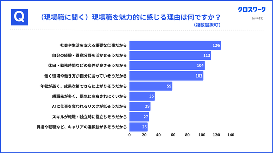 現場職かつ、現場職に魅力を感じると答えた人419人に理由を聞いたところ、最も多かったのは「社会や生活を支える重要な仕事だから」で約3割の126人でした。次いで「自分の経験・得意分野を活かせそうだから」113人、「休日・勤務時間などの条件が良さそうだから」104人、「働き方が自分に合う」102人が続きます。