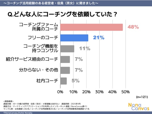 コーチングファーム経由が約半数(48%)を占める一方、フリーランスのコーチ(21%)も一定の市場シェアを持っていることがわかります。
