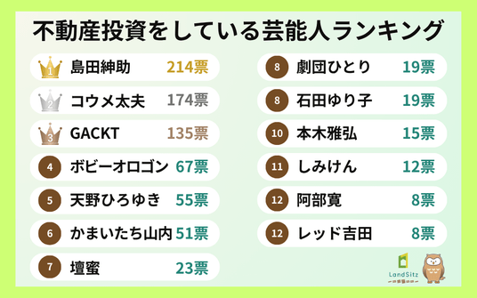 調査の結果、「不動産投資をしている芸能人」として最も多く挙げられたのは島田紳助さんで214票を獲得し、堂々の1位となりました。