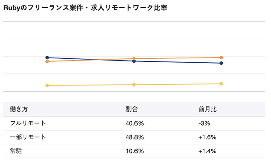 2025年10月時点のRubyフリーランス案件・求人におけるリモートワーク比率は、フルリモートが40.6%、一部リモートが48.8%、常駐が10.6%です。前月比はフルリモートが−3%で減少し、一部リモートは+1.6%で増加、常駐は+1.4%と小幅に上昇しています。