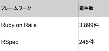 2025年10月時点のRubyフレームワーク別案件数では、1位がRuby on Railsで3,899件、2位がRSpecで245件です。