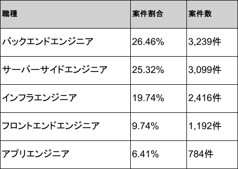 2025年10月時点のRuby案件の職種は、バックエンドエンジニア26.46%(3,239件)が最多、次いでサーバーサイドエンジニア25.32%(3,099件)、インフラエンジニア19.74%(2,416件)、フロントエンドエンジニア9.74%(1,192件)、アプリエンジニア6.41%(784件)です。