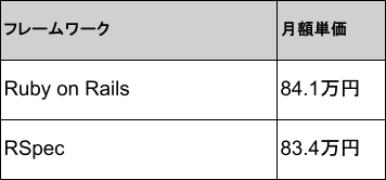 2025年10月時点のRubyフレームワーク別の月額単価は、1位がRuby on Railsで84.1万円、2位がRSpecで83.4万円です。