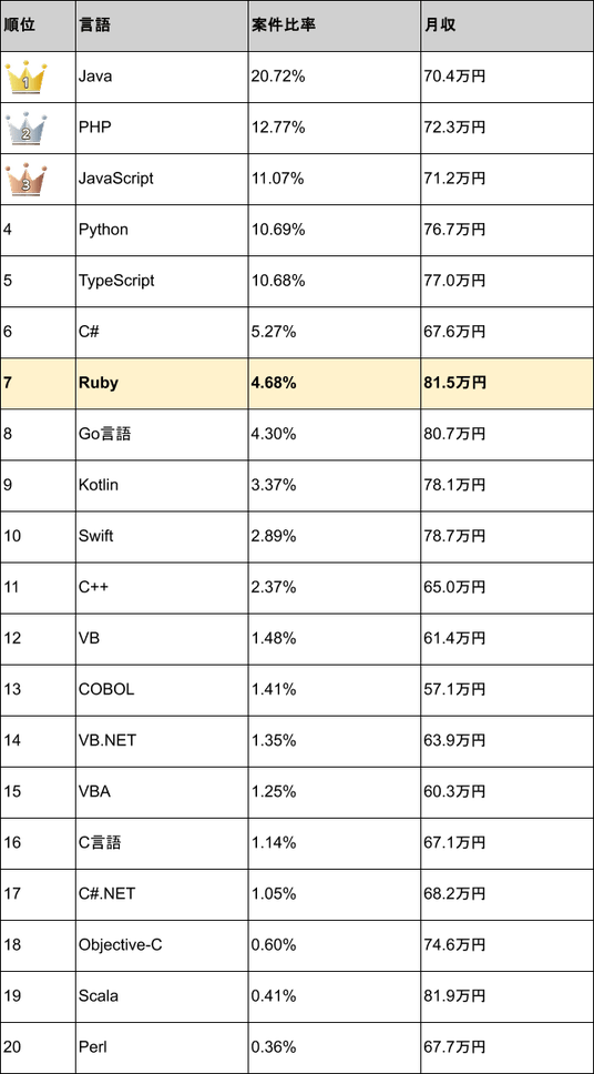 2025年10月時点でRubyの案件は市場全体の4.68%を占め、案件数は7位、平均月額単価は81.5万円と安定しています。