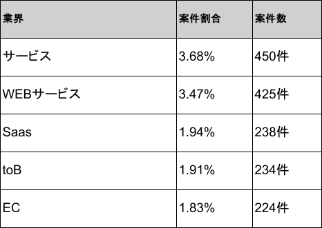 2025年10月時点のRuby案件は、サービスが3.68%(450件)で1位、Webサービスが3.47%(425件)で2位、SaaSが1.94%(238件)で3位、toBが1.91%(234件)で4位、ECが1.83%(224件)で5位となり、上位5業界で全体の約12.8%を占めます。