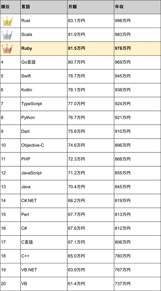 Ruby案件の平均月額単価は81.5万円、平均年収は978万円で、プログラミング言語別の年収ランキングでは3位に位置しています。