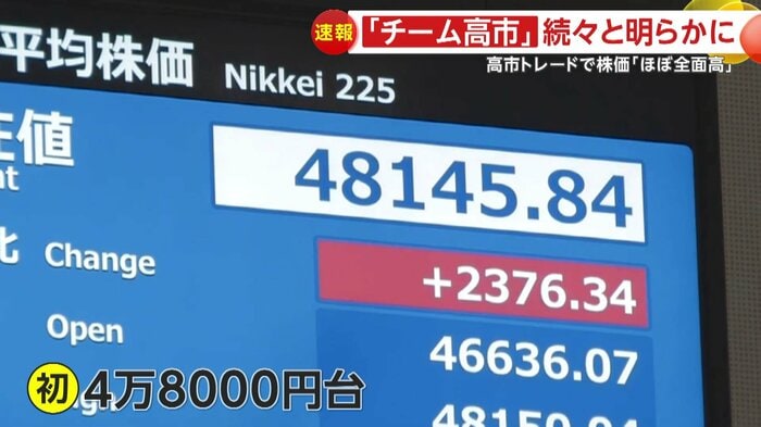 日経平均株価の上げ幅は2000円を超え、取引時間中として初めて4万8000円台をつけた。