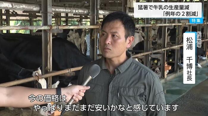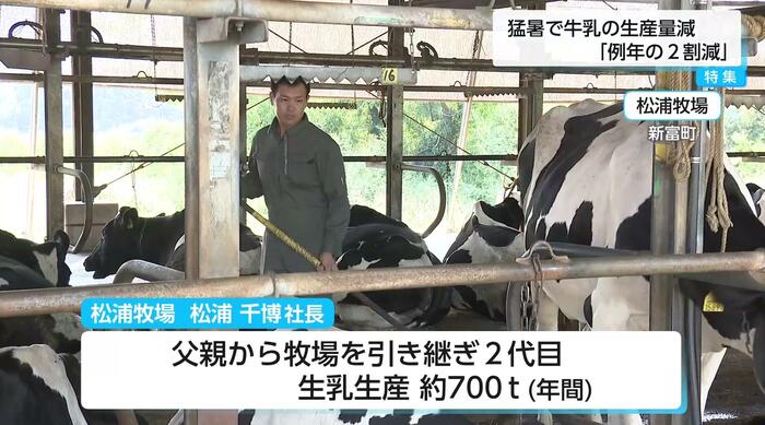新富町で年間約700トンの生乳を生産する松浦牧場。2代目として牧場を経営する松浦千博社長は、この夏の状況を「夏場がめちゃめちゃ暑かったので、例年に比べると2割くらい生産量が減っている」と話す。