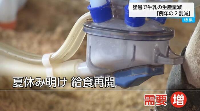 九州生乳販連によると、夏休みが終わり、学校給食が再開し需要が増える中で猛暑が続いたため生産量が回復せず、九州全体で生乳が不足する事態となっている。