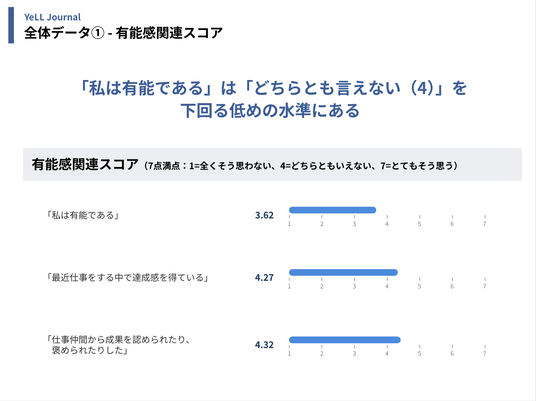 「私は有能である」という質問に対する回答は平均3.62点(7点満点)と、中間値の4点を下回る結果に。一方で、チーム環境に関する指標は相対的に高く、特に「傾聴環境」は5.20点と最も高い数値を示しました。