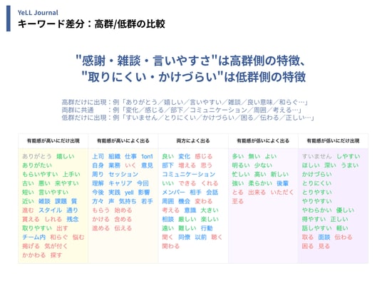 有能感が高い人では「ありがとう」「嬉しい」などのポジティブな関係性を示す言葉が特徴的に現れました。一方、低群では、コミュニケーションに関してネガティブな表現が目立ちました。
