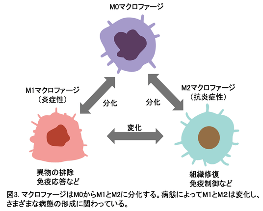 注4)マクロファージ:免疫細胞の一つで、全身の組織に広く分布し、体内に侵入した異物を食べて消滅させたり、他の免疫細胞へ知らせたりする役割がある。マクロファージ(M0)は活性化されると、炎症を引き起こす炎症性マクロファージ(M1)と組織修復に働く抗炎症性マクロファージ(M2)に分化し、そのバランスがさまざまな病態形成に関わっている(図3)。