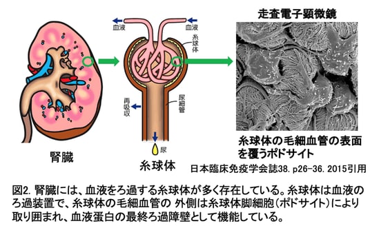 注3)糸球体足細胞(ポドサイト):糸球体にて血液の成分をろ過して尿を作る時、血液中の蛋白が漏れ出さないように、毛細血管の表面を覆っている細胞。ポドサイトの数が減少すると血液中の蛋白が漏れだして蛋白尿が出るようになり、それが持続すると糸球体そのものが壊れて、血液のろ過が十分に行えなくなる。