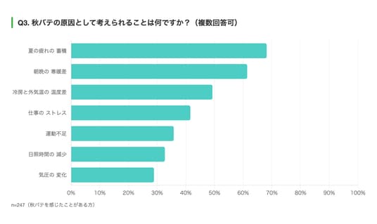 その結果、約68%の方が「夏の疲れの蓄積」、約61%が「朝晩の寒暖差」を原因として挙げており、夏から秋への季節の移り変わりと気温変化が体調に大きな影響を与えていることが分かりました。