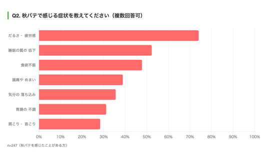 その結果、最も多いのは「だるさ・疲労感」で約74%、次いで「睡眠の質の低下」(52%)、「食欲不振」(48%)という結果になりました。心身ともに不調を感じている方が多いことが明らかになりました。