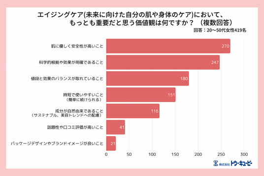 「肌に優しく安全性が高いこと」64.4%、「科学的根拠や効果が明確であること」58.9%が上位。続いて「値段と効果のバランスが取れていること」43.4%。