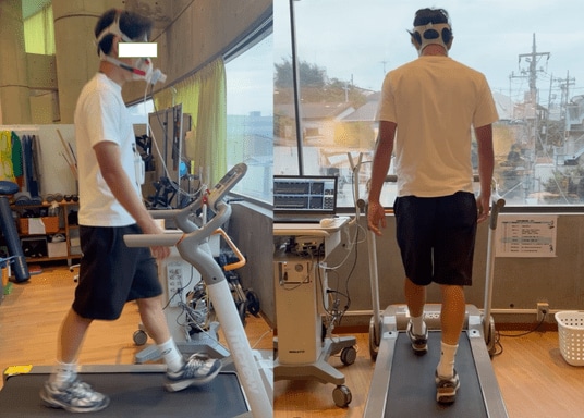 (画像1)ウォーキングマシン上で行った“大股歩行”と“至適歩幅”の歩行検証