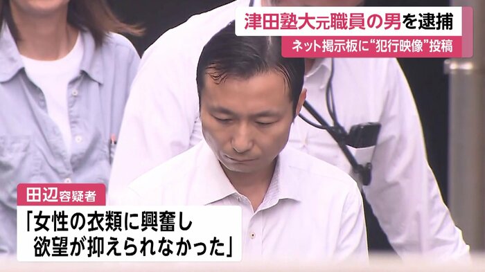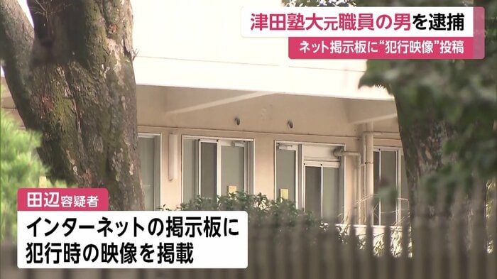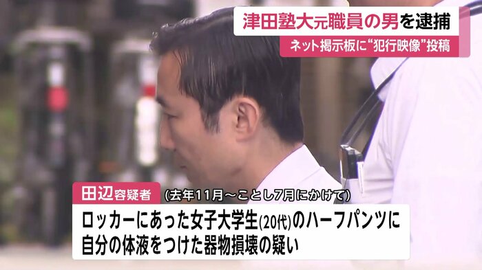津田塾大学の元職員・田辺佑介容疑者(43)は、去年11月から今年7月にかけて、東京・小平市にあるキャンパスのロッカーにあった女子大学生のハーフパンツに自分の体液をつけた器物損壊の疑いが持たれている。