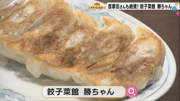 彦摩呂さん、まずは餃子を一つつまんで「うわあ。裏側見せますよ。ほら、もう焼き目の裏側がもうもっちりふっくら見てこれ。ちょっとスケルトンで具材が見えてますよ、これ。いや、レースのカーテンや!」