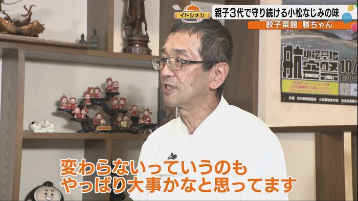 小松市の餃子菜館 勝ちゃん。店内には80席あり、多い時には1日300人ものお客さんで賑わうそうだ。現在腕を振るうのは、2代目社長の高輪宗己さんと3代目の健太郎さん。親子で小松市民の馴染みの味を守り続けている。