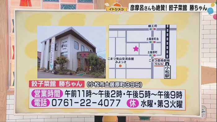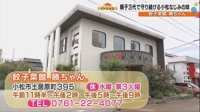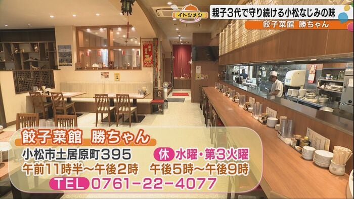 JR小松駅のすぐそばにある餃子菜館勝ちゃん。ランチは午前11時から午後2時、ディナーは午後5時から午後9時まで営業している。小松を訪れた際は、ぜひ一度足を運んでみてはいかがだろうか。きっと、街角のインタビューで男性が語った「他で食べたことないような味」を体験できるはずだ。