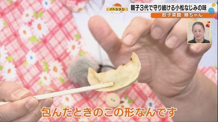彦摩呂さんが餃子を裏返すと確かにつるーんとしてひだがない。「手で餡を乗せ、皮を乗せて、具をのせて包んだ時の形なんです。」と高輪さん。