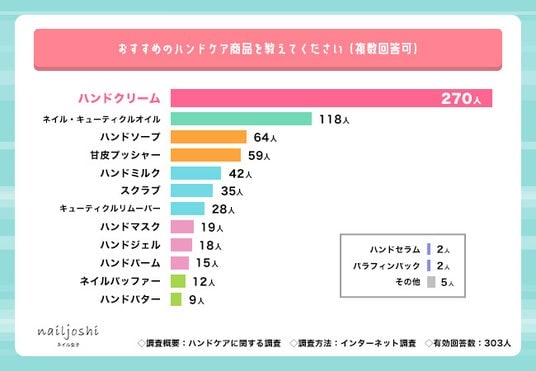 ・おすすめのハンドケア商品、1位は『ハンドクリーム』(270人)が圧倒的、2位『ネイル・キューティクルオイル』(118人)、3位『ハンドソープ』(64人)