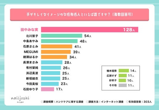 次に「手がキレイなイメージの女性有名人といえば誰ですか?(複数回答可)」と質問したところ、田中みな実さん(128人)が圧倒的な1位を獲得。2位は北川景子さん(54人)、3位には中条あやみさん(48人)がランクインしました。
